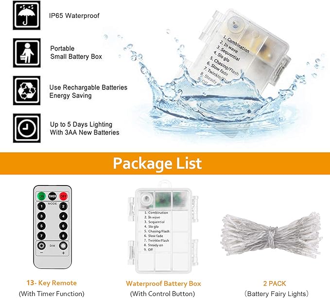 - 【Outdoor String Lights Christmas Lights】Adopted with IP65 waterproof battery box and string lights, you can easily carry and place the outdoor string lights anywhere you like, suitable for use where rain, spraying water, snow are likely. We will help you within 24 hours, please feel free to contact us.We are committed to providing you with a better shopping experience! NOTE: Product is suitable for 3AA batteries (not included) not button batteries