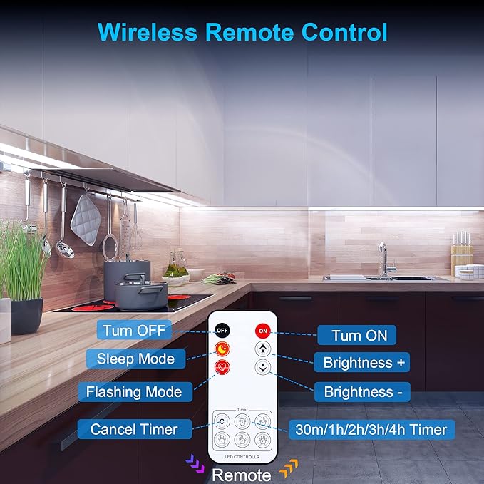 - Timer and Memory Function: 30 minutes, 1/2/3/4 hours timing off available, choose a time to turn off your lights if you need. And under cabinet light can save personal settings to ensure that it has the same brightness each time it is activated.
