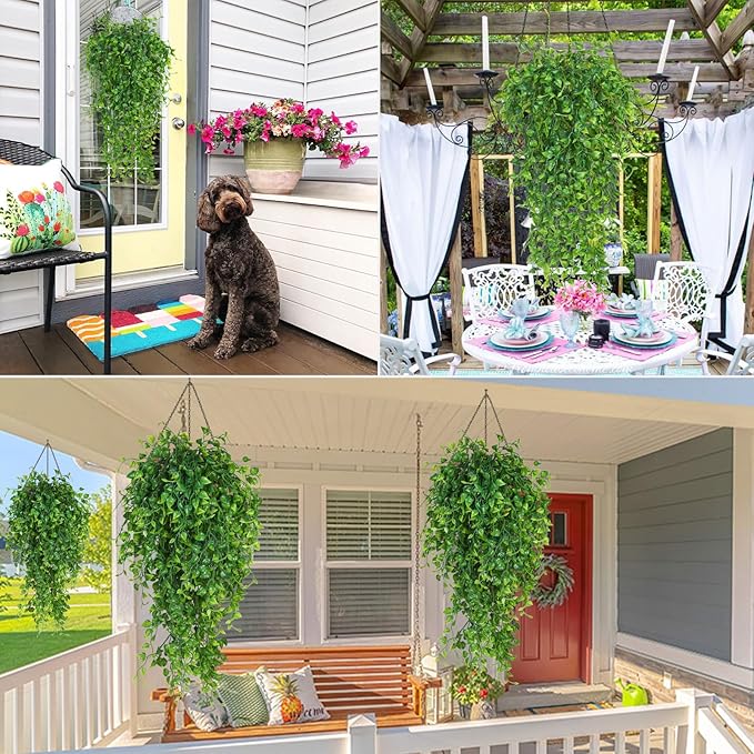- No Maintenance Required &UV Resistant: Artificial fake hanging plants for outdoor are UV resistant, more realistic, natural vibrant color, No need to maintain or care for them, can be washed by water and never fade. Not falling off, good wear resistance, Non-flammable. NOTE: Artificial plants are inevitable with smell, you can put it in a ventilated place for 1-2 days. Waterproof garland can be used for natural garden decoration
