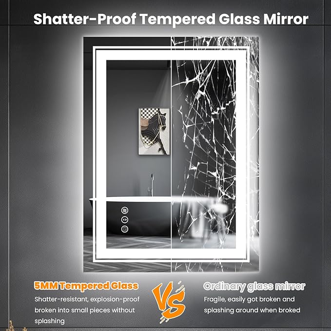 - Shatter-Proof Glass & Safer To Use: Snowdool Led bathroom mirror with light is made of high quality 5MM tempered glass, shatter-proof, explosion-proof, splash-proof design ensures the safety of you and your family, use with confidence