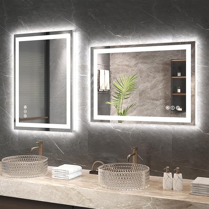- [Flexible Installation Options]: The lighted bathroom mirrors for wall Choose between plug-in or hardwired power supply. Includes Z-bar mounting system for secure installation (vertical or horizontal).Low-maintenance design - wipes clean effortlessly